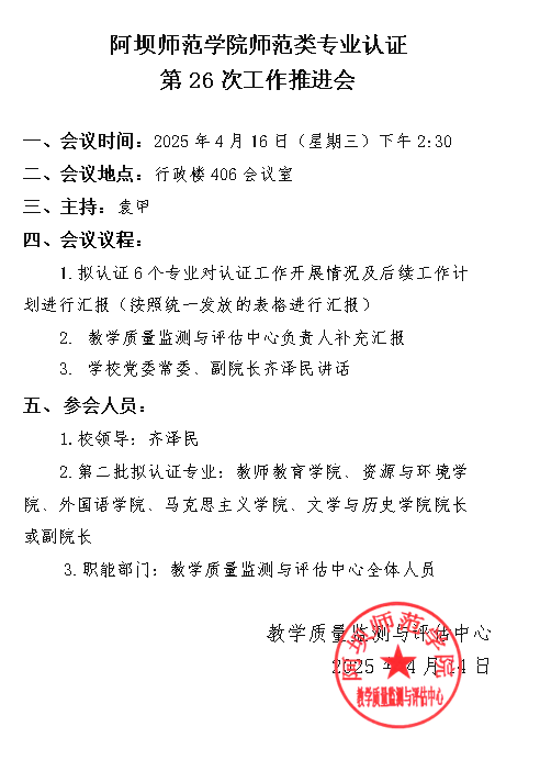 关于召开阿坝师范学院师范类专业认证第26次工作推进会的通知