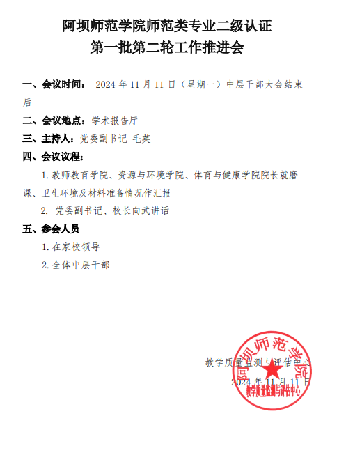 关于召开阿坝师范学院师范类专业二级认证 第一批第二轮工作推进会的通知