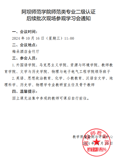 关于召开阿坝师范学院师范类专业二级认证后续批次现场参观学习会的通知