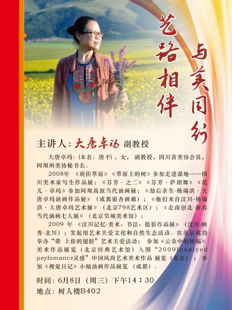【教院讯】6月8日14:30,经过前期充分地准备和筹划,教师教育学院特邀请中国工艺美术家协会会员、四川省美术家协会会员、阿坝州美术家协会秘书长大唐卓玛(本名:唐平)副教授为同学们做了题为“艺路相伴,与美同行”的美育讲座。本次讲座由教师教育学院副院长王小琴主持,教师教育学院2021级、2020级小学教育专业学生及其他专业师生共计100余人到场聆听了本次讲座。