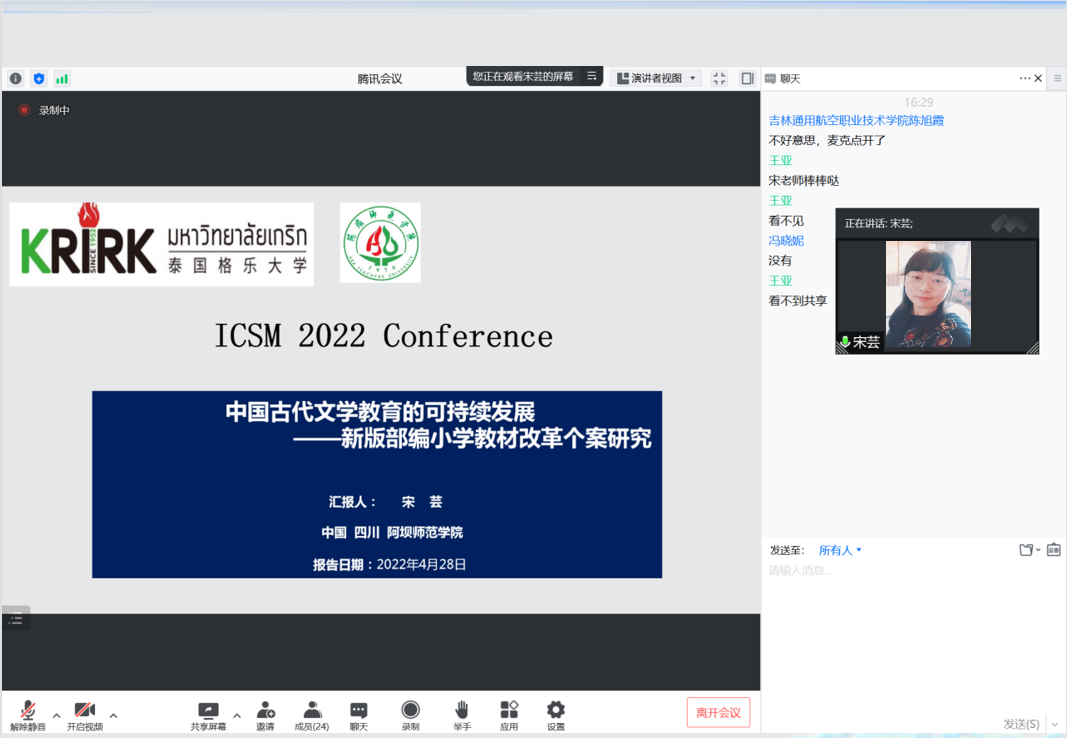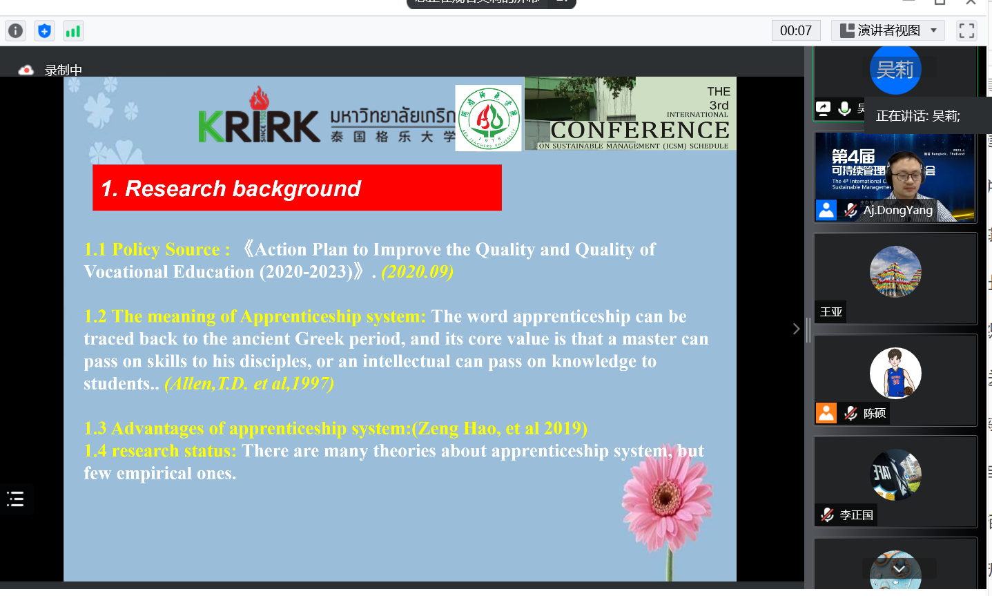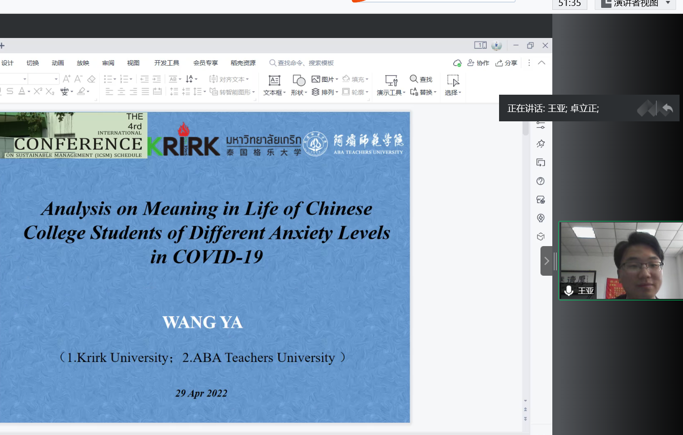 【本网讯】第四届可持续管理国际研讨会(The 4th International Conference Sustainable Management)于当地时间2022年4月28-29日,在泰国曼谷格乐大学举行。来自泰国、中国、印度、老挝、德国、英国等国家的300余位教育、管理、艺术、工程、公卫、法律相关领域研究专家、学者相聚云端,围绕“‘一带一路’政策背景下的可持续管理”主题进行了深入研讨。我校高度重视,学校对外合作处外事办公室副主任钟义带领多名教师参会。其中,王小琴、吴莉、宋芸、王亚四位教师提交的论文,经会务组专家评审,受邀作交流发言。