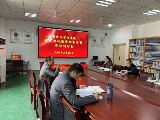 【本网讯】为进一步加强课程思政建设,深化课程思政改革,充分发挥各类课程的思想政治教育功能,提高全体教师立德树人的能力和水平,3月24日下午,经济与管理学院(以下简称“经管学院”)在学院会议室召开《课程思政教学指导手册》学习研讨会。全体教师参加此次会议。李清茂主持会议。