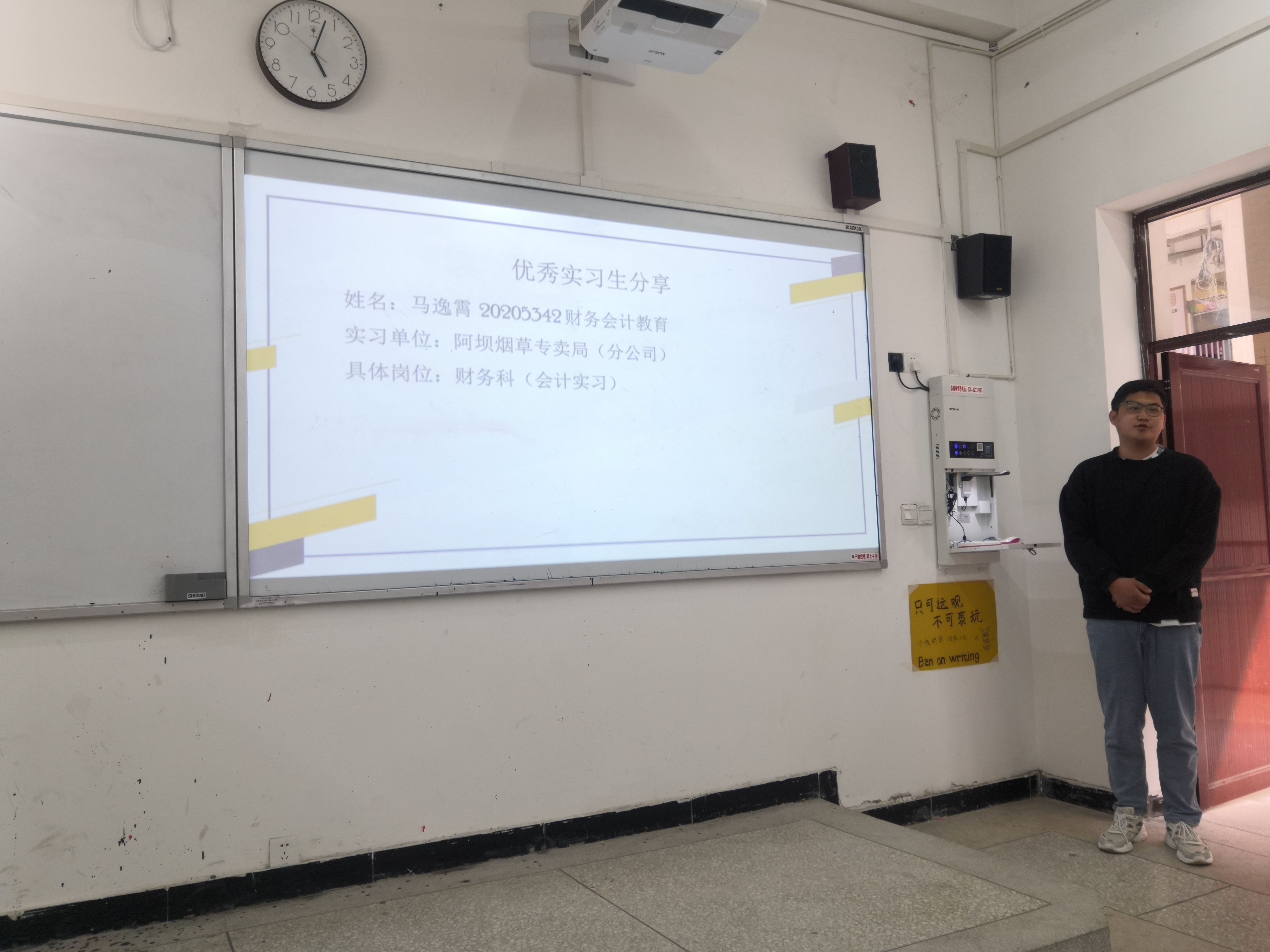 接着,财务会计教育专业的马逸霄同学分享他在阿坝烟草专卖局的实习经历。