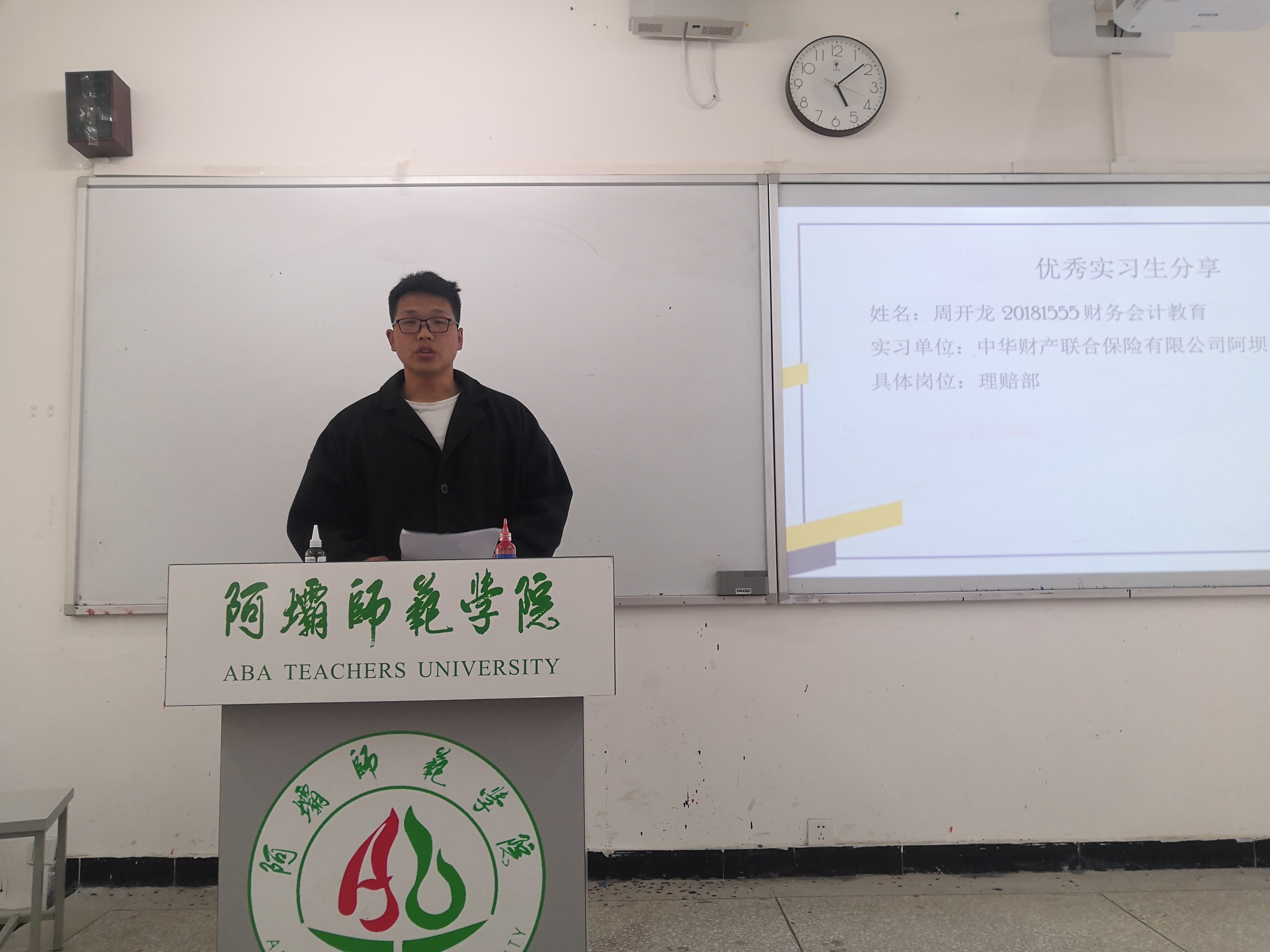 最后,财务会计教育专业的周开龙同学分享他在中华财产联合保险公司阿坝中心支公司的实习经历。