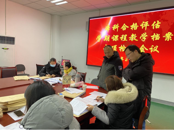 副校长宋弘和教务处孙丹讲话完毕,马院院长梁建东带领马院其他参会教师一起就我院2021-2022学年第一学期课程教学档案进行逐一检查,并就存在的问题与我院相关任课教师进行及时的沟通和交流。最后,教务处、两院领导和教师还针对课程考核方式、教学档案整理归档等问题进行意见交流。