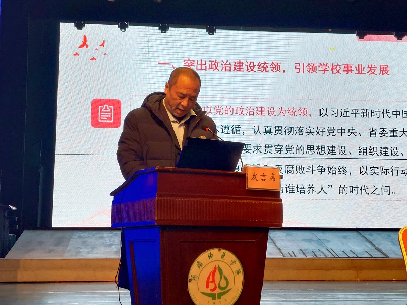 学校党委书记吴昊作《加强党建工作 落实党对学校工作的全面领导》主题讲话。吴昊强调,为全面推进学校各项工作,让党建工作更好的融入实际,为“两评估两转型”目标的实现提供坚强的政治保证,必须做好五个方面的工作:一是突出政治建设统领,引领学校事业发展。坚持以党的政治建设为统领,突出思想政治引领,召开党员代表大会,开展党史学习教育,以巡视整改为契机推进学校各项工作。二是强化思想建设,筑牢理想信念根基。坚持主题教育常态化制度化,守好意识形态安全大门。三是狠抓组织建设,提升队伍活力。坚持和完善党委领导下的校长负责制,紧抓“关键少数”,探索“党建+”工作思路,加强基层党组织建设,持续开展党员示范项目和“双创”建设。四是强化作风建设,弘扬清风正气。坚持民主集中制,结合省委第二巡视组反馈问题开展专项整治,狠抓师德师风建设。五是加强纪律建设,从严管党治党。
