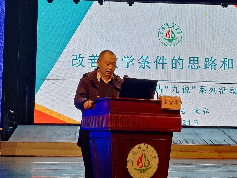 党委常委、副校长宋弘作《改善教学条件的思路和举措》主题讲话。宋弘介绍了学校教学条件现状,分析了场所设备利用率有待提高、布局结构不合理、实验室开放程度不高等主要问题,并指出学校将积极采取专项核实数据、有效投入设备、做好设备必要更换、推动实验室建设、推进实验室开放共享、加强图书资源建设、提高管理服务水平等多项措施,有效改善教学条件。