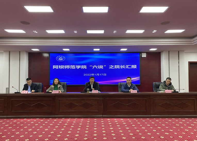 【本网讯】为进一步推进我校本科教学工作合格评估与建设工作,提升评建工作质量,按照《阿坝师范学院2021-2022学年第一学期评建工作计划》和《阿坝师范学院评建工作办公室关于开展评建工作“六说”活动的通知》要求,我校于1月17日,在行政楼二楼会议室召开评建“六说”活动之院长报告会,学校党委副书记、校长向武,党委常委、副校长毛英,党委常委、副校长马昌威,党委常委、副校长宋弘,成都师范学院副校长任迎虹,四川旅游学院质评处处长杨江伟,西南交通大学教务处副处长康锐,各二级学院党政负责人、教研室主任、教科办主任、专业带头人参加会议。毛英同志主持会议。