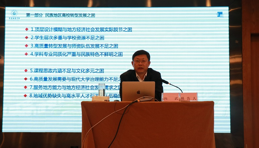 大会主题报告阶段由毛英主持。刘勇和向武分别作了《关于新时代民族教育命运的反思——以涉藏区域教育为例》和《民族地区高校转型发展的思考》的报告。刘勇以“藏学从1951年中国语言文学系的一个班,发展到今天,已经形成本科、硕士、博士、博士后流动站的具有中国特色的完整的藏学体系”为例,回顾了我国民族教育发展历程及取得的辉煌成就,对新形势下,如何推进民族教育发展作了深入阐释。向武从民族地区高校转型发展之困、我国教育发展之大势、我校转型发展之路三个方面对我国当前教育变革形势和民族地区高校转型发展面临现状作了深入的分析,对我校通过加强一体化教育教学改革、产教融合转型发展和加强治理体系和治理能力现代化建设作了详细的阐述,对学校特别是藏汉双语学院建成民族地区师资培养的摇篮、民族文化传承的重要基地和民族团结进步的重要阵地提出殷切期望。