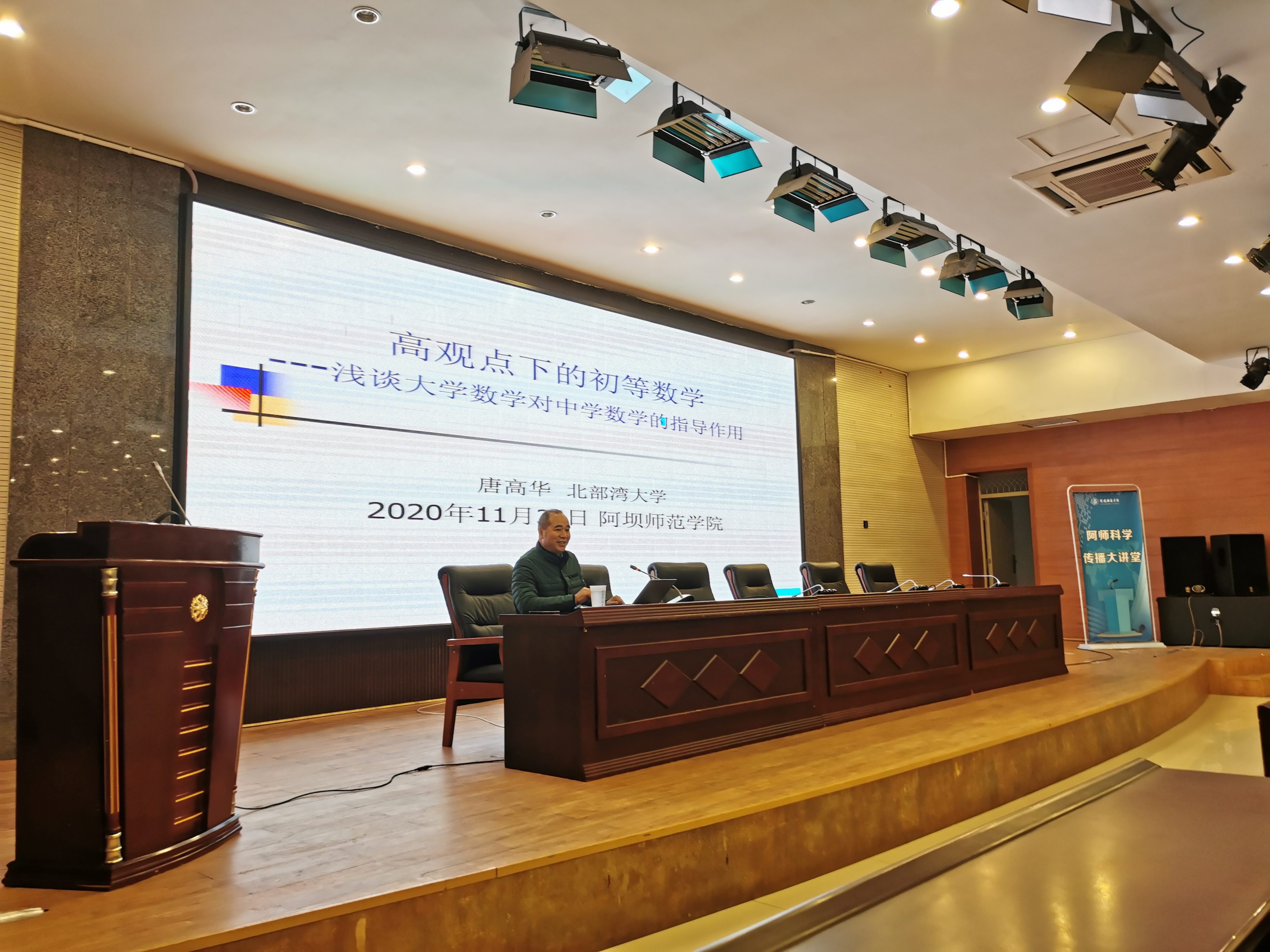 【本网讯】11月24日10:00,阿师科学传播大讲堂、名师讲堂:《高观点下的初等数学——浅谈大学数学对中学数学的指导作用》在学校学术报告厅进行,主讲教师:北部湾大学副校长、博士生导师唐高华教授,来自数学与应用数学专业各班学生,以及学校其他数学爱好者聆听了此次讲座,数学学院副院长杨仕椿教授主持了讲座。