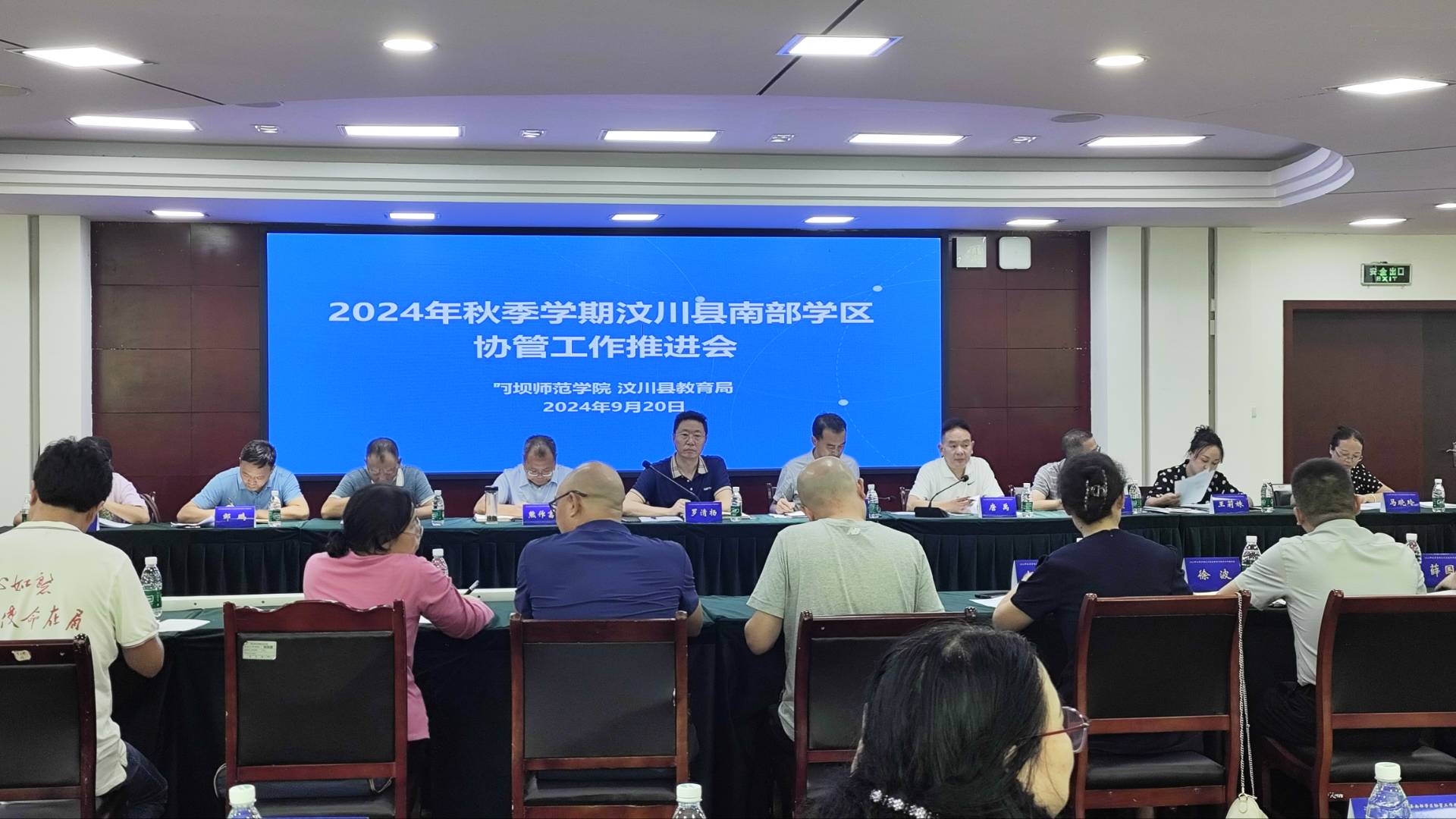 【本网讯】9月20日14:30,我校于行政楼二楼会议室召开2024年秋季学期汶川县南部学区协管工作推进会。汶川县教育局党委委员、教培中心主任李永强,汶川县教育局教研室主任余瑛、副主任韩俊;水磨中学、八一小学、汶川第二幼儿园、七一映秀中学、映秀小学、中国中铁映秀幼儿园、漩口小学、三江小学、卧龙小学等中小学相关负责人;我校对外合作处处长罗清杨、副处长唐禹及各二级学院相关负责人参加了此次会议。会议由唐禹主持。