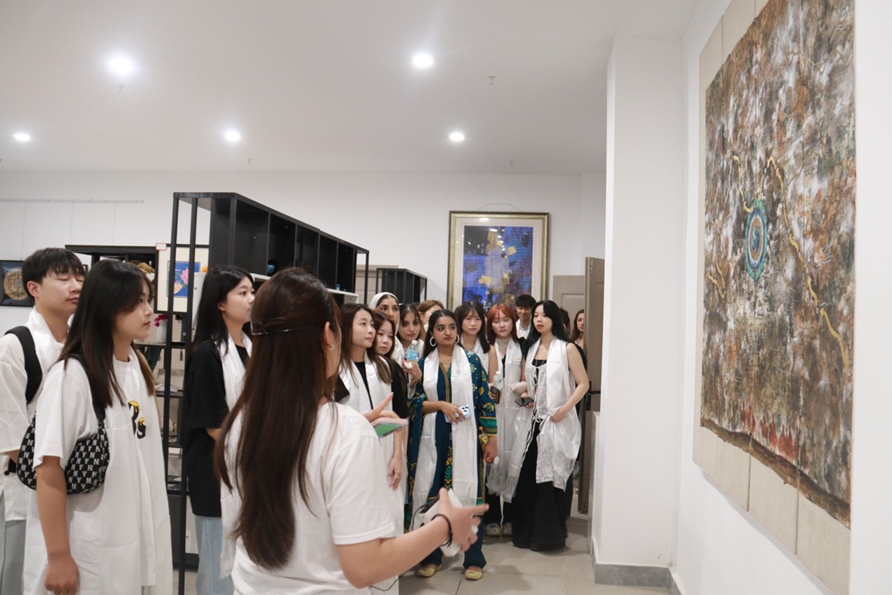 图一:美术学院学生卢纯玲为川港、巴基斯坦青年讲解藏纸作品