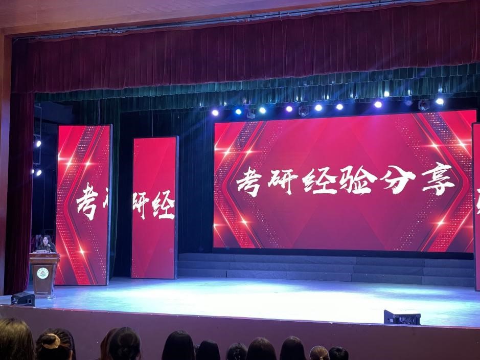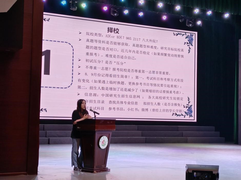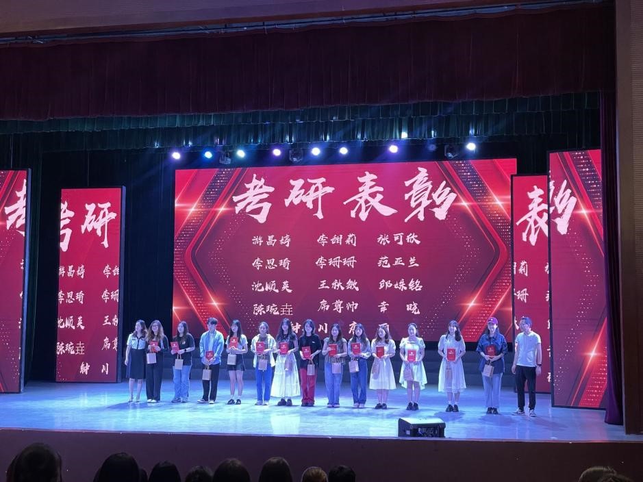 会议伊始,全体起立,奏唱国歌。随后,刘院长依次介绍了出席本次大会的领导及嘉宾。接着,张书记和尹副书记上台为我院14名考研成功学子颁发荣誉证书和奖品,并合影留念。紧接着进入考研经验分享环节。在分享会上,陈婉垚、游昌婷、李甜莉等9名优秀学子分别从不同的角度向同学们分享了自身考研的成功经验以及心路历程,她们结合自己的实战经验,谈到了备考期间的酸甜苦辣,分享了有效的学习方法和备考策略,以及在不同阶段的学习重点和心态调整秘诀,她们的成功经验使在场同学们对于考研备考有了更加清晰的认知,也让同学们对未来的考研之路充满了信心与期待;范亚兰同学分享了自己从备考到申请留学的经历,向同学们详细介绍了择校、准备申请材料、办理签证等方面的内容。