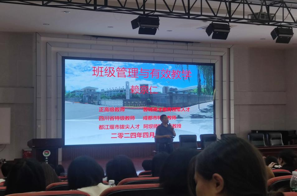 在用完午餐后,同学们又来到都江堰外国语实验中学,到学术报告厅听取赖宗仁老师精心准备的讲座:《班级管理与有效教学》。赖老师结合自身经历将讲座内容娓娓道来:班级管理、有效教学、班级管理易出现的问题、加强班级管理提高有效教学的策略等内容的分享,使同学们受益匪浅。