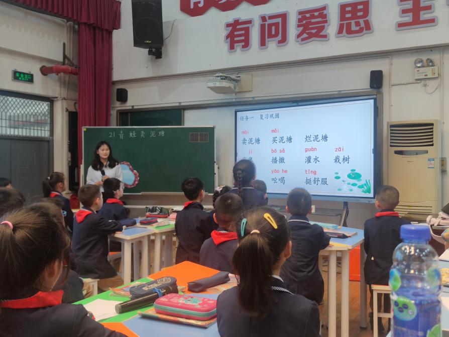 在二年级七班的课堂《青蛙卖泥塘》上,练文月老师解锁各种课堂小任务:朗读、勾画关键信息、自我表达、表演“吆喝”,最后以书写重点词语结束本堂课程。