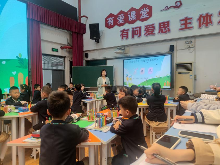 上午第二节课,同学们观摩了一年级一班罗利蓉老师的数学课《小兔请客》。罗老师通过一个小兔请客的故事不断提出整十数的加减法问题,甚至让小朋友们自己提出问题并自己思考解决。数学课的教学思维和语文课有所区别,但老师们都体现了以学生为主体的核心理念。