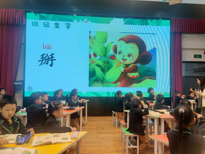 上午第一节课,同学们来到友爱学校学术报告厅,观摩了一年级五班的余椿玲老师的课程《小猴子下山》。余老师将她的课程分为“会记、会看、会合作、会思考”四部分,让小朋友们通过不断地朗读课文、模仿小猴子的各种动作来理解课文内容。她的课堂效果显著,学生们踊跃回答问题,积极与老师互动。
