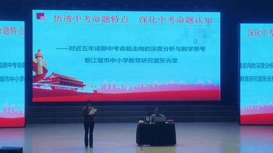 【本网讯】为了全面落实师范生教学能力的提升,促进师范生转变教学观念,改进教学方法,提高学生的师范技能和实践能力。4月25日,马克思主义学院邀请都江堰市中小学教育研究室教研员张光奎老师于南苑剧场开展以“中考试题特点与思政课教学能力提升”为主题的教育教学讲座。我院思想政治教育专业主任李益芬老师,郭健老师以及全体思政专业学生参加了本次讲座,此次讲座由李益芬老师主持。