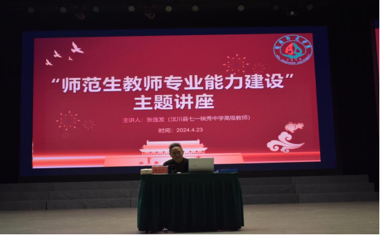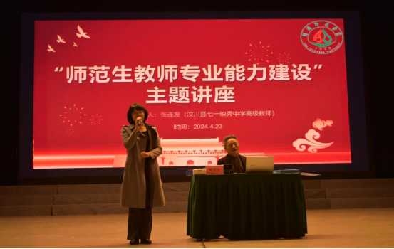 【本网讯】为了推进师范专业认证工作,落实人才培养方案,提高人才培养质量,进一步加强对师范生教师专业能力的建设。4月23日,马克思主义学院邀请汶川县七一映秀中学高级教师张连发于南苑剧场开展师范生教师专业能力建设教育教学讲座。我院副院长杨友国,思想政治教育专业主任李益芬老师以及全体思政专业学生参与了本次讲座,此次讲座由李益芬老师主持。