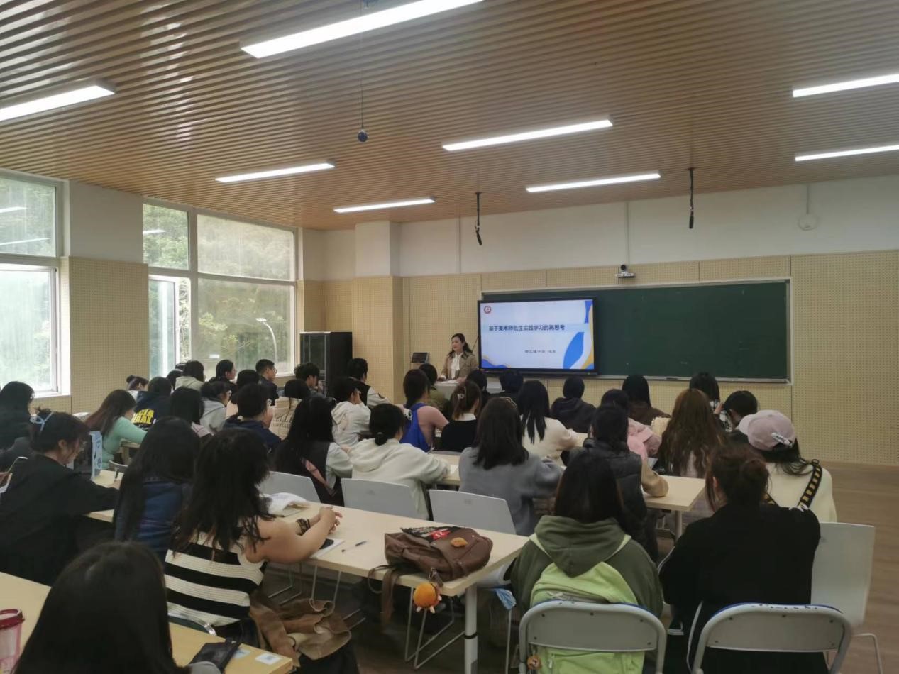 【本网讯】2024年4月11日,美术学院荣幸地邀请到都江堰中学的美术教师冯芹老师,为2023级美术学专业的学生们带来了一场题为《基于美术师范生实践学习的再思考》的讲座。此次活动得到了学院的高度重视,美术学院副院长焦凤、美术教研室主任王正伟以及任课教师王望、母春生均亲临现场,与学生们一同聆听冯芹老师的精彩分享。