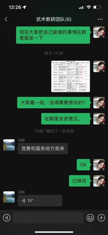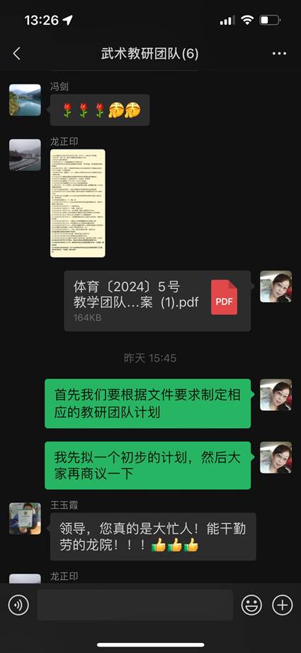 经过充分的讨论和交流,所有成员在群里达成了共识,最终确定了武术教研团队的工作计划。最后,付文灿组长在群里面又发出了对每一个成员的工作要求,希望每个人都能够按照计划分工合作,共同为武术教研团队的发展贡献力量。