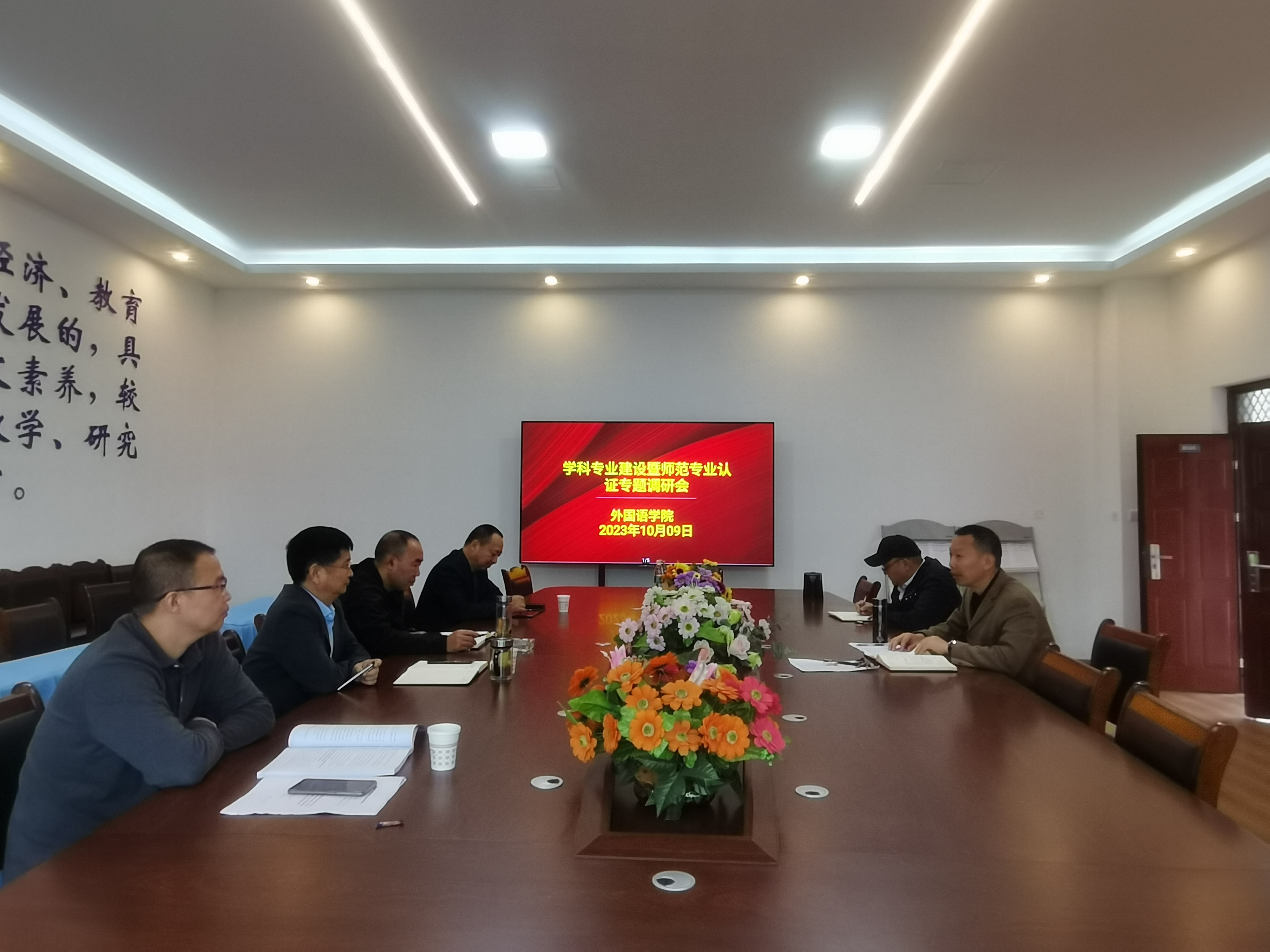 【本网讯】 2023年10月9日上午10点30分,学校党委常委、副校长齐泽民莅临外国语学院开展学科专业建设暨师范专业认证专题调研并指导学院工作,参与调研指导的还有教务处处长吴文权、科研与学科建设处处长杨子松、发展规划处副处长袁甲。外国语学院党委书记张茂军、教科办主任卜庆立参加了本次调研座谈会。
